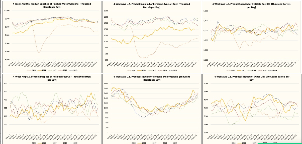 此外,在美国石油需求继续改善的背景下,一旦航空燃油需求改善,美国的石油需求将在2022年继续表现出众。下图图表基本上表明,各类石油需求一直在持续上升,预计在2022年内还会有更多需求,尤其是目前航空燃料需求仍然远远低于历史平均水平。