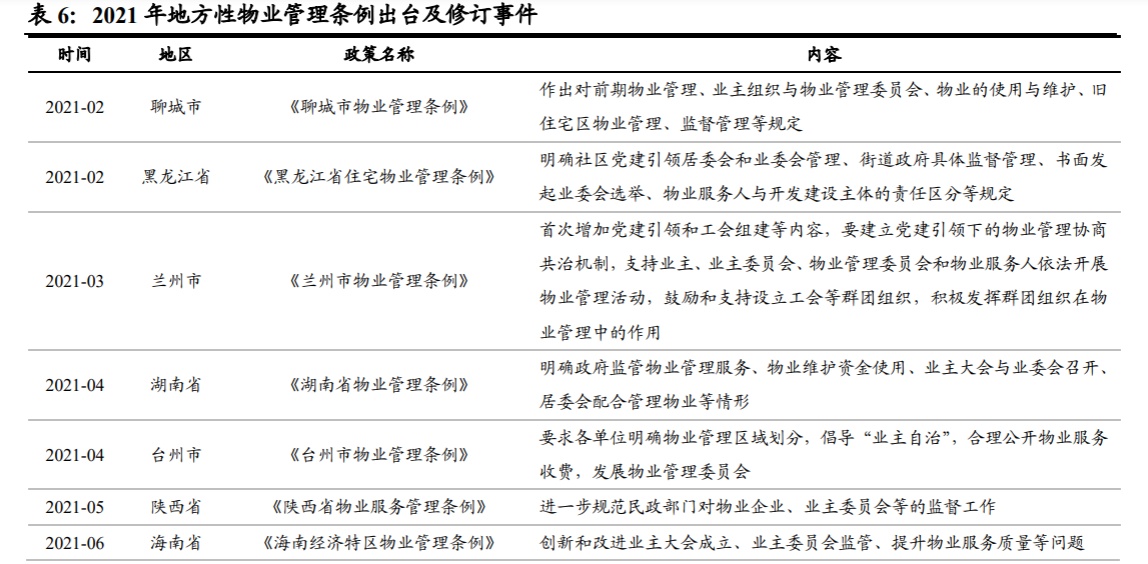 显然,中央的政策效应也得到了地方政策的跟随。1月至6月,随着年初十部委新政出台,各地逐渐跟进完善地方性物业管理条例,比如黑龙江省推出了《黑龙江省住宅物业管理条例》、湖南省推出了《湖南省物业管理条例》...这些条例与十部委新政带来的促进作用大同小异,都是为了强化物管的基层治理作用。