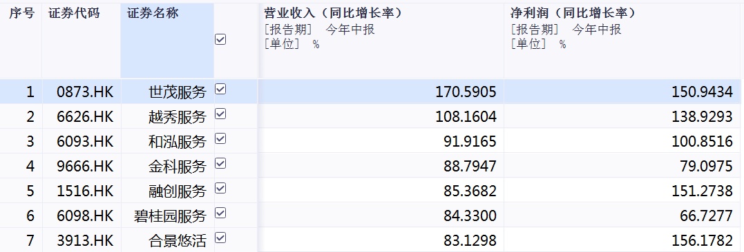 具体而言,营收方面,几乎所有港股物业股的营收在今年上半年录得增长,有2家物业股营收同比增长超100%,25家物业股营收同比增长超100%。净利润方面亦如此,近乎所港股物业股在今年上半年都录得增长,逾10家物业股净利润同比增长超100%,有2家物业股净利润同比增长超200%,1家物业股净利润同比增长逾2000%。