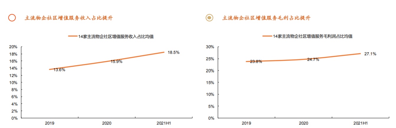 据了解,自2019年以来主流物企社区增值服务收入、毛利润占比就呈现出持续提升的态势,至2021H1贡献比例分别升至18.5%、27.1%,已成为利润贡献重要来源。而随着头部公司进一步通过并购整合扩大规模、加深密度,这些公司的社区增值服务发展有望迈入一个新的“台阶”。
