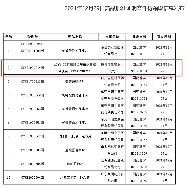 智通财经APP获悉,12月29日,康希诺生物-B(06185)研发的ACYW135群脑膜炎球菌多糖结合疫苗(CRM197载体)已被药监局正式获批,批准文号为“国药准字S20210054”,签发日期为2021年12月27日。这是国内首款获批上市的四价脑膜炎结合疫苗(MCV4),也是康希诺除新冠疫苗、流脑二价疫苗以及埃博拉疫苗以外第4个获批的疫苗产品。