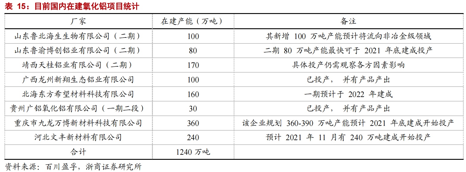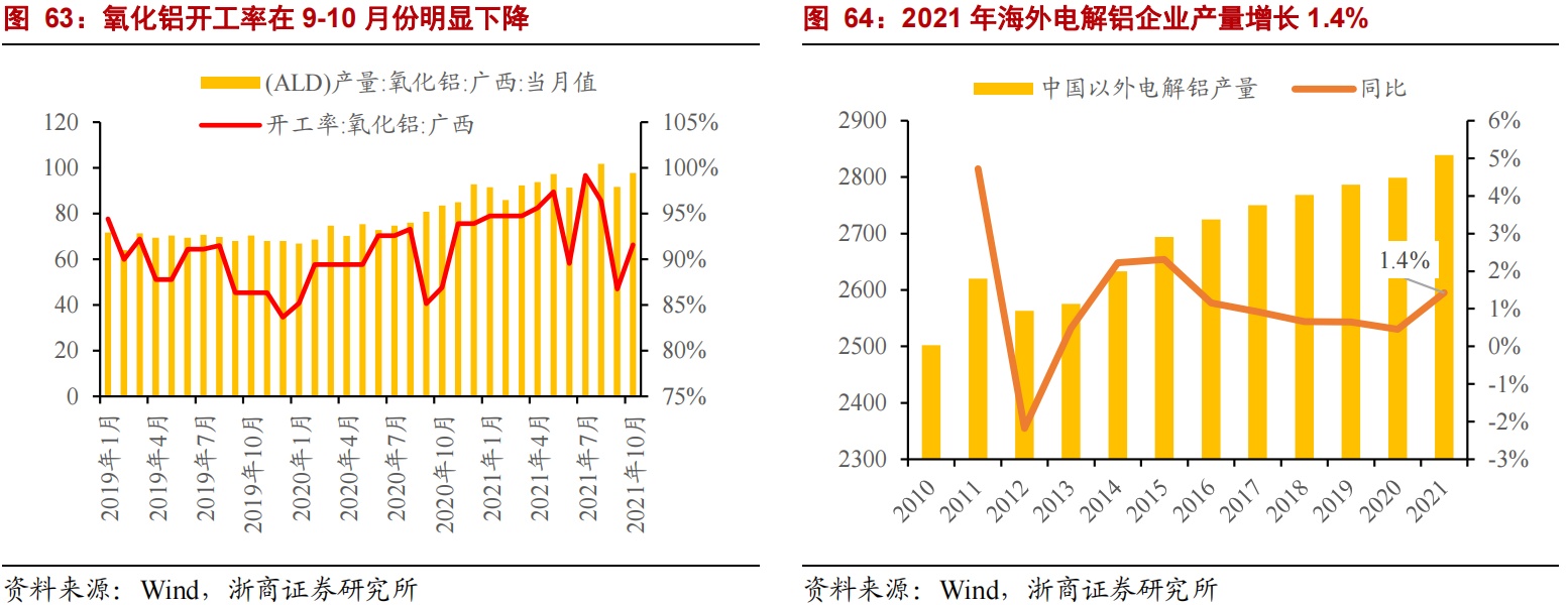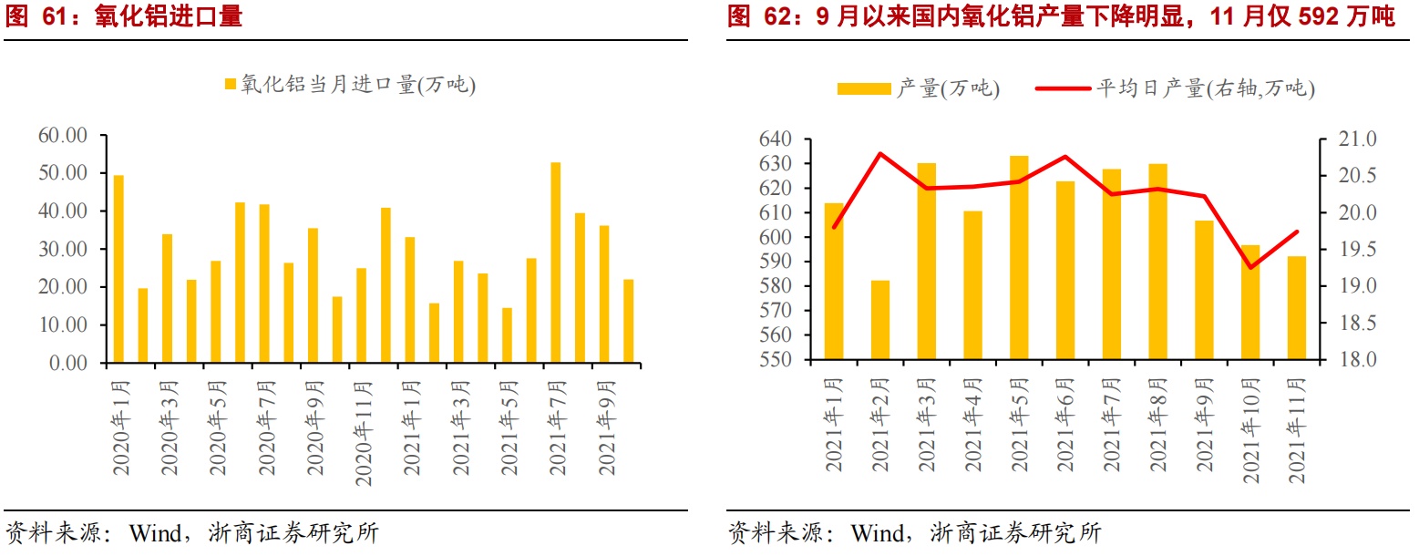展望2022年,国内仍有多个大型氧化铝项目待投产。氧化铝环节耗能并不大,从广西、贵州等地9-10月的限产政策来看,实际影响远没有传言的那么大,而且在明年整体能耗限制边际放松的背景下,氧化铝供给端继续出现干扰的可能性不大。除了现有的8952万吨氧化铝产能,明年还将有多个新增项目投产,可能影响较大的有重庆九龙万博360万吨、北海东方希望160万吨、靖西天桂铝业170万吨。因此该行认为,明年氧化铝的供应格局仍将维持过剩,今年9-10月份的短缺仅是暂时现象。