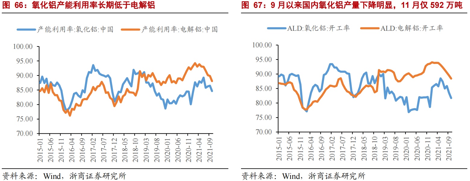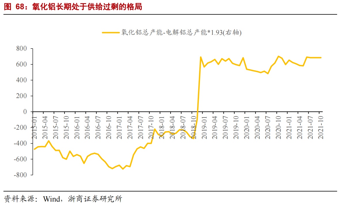 在过去的多年中,氧化铝长期处于供给过剩的格局。由于电解铝的产能天花板已早早确定,电解铝的产能增量十分有限。2021年10月,电解铝在产产能为3787万吨,对应氧化铝需求7271万吨,但氧化铝在产产能为7315万吨,若对比氧化铝总产能8952万吨,则差别更大,达到1681万吨。该行也可以看到过去三年中电解铝的开工率普遍在90%以上,而氧化铝的开工率长期不足85%。