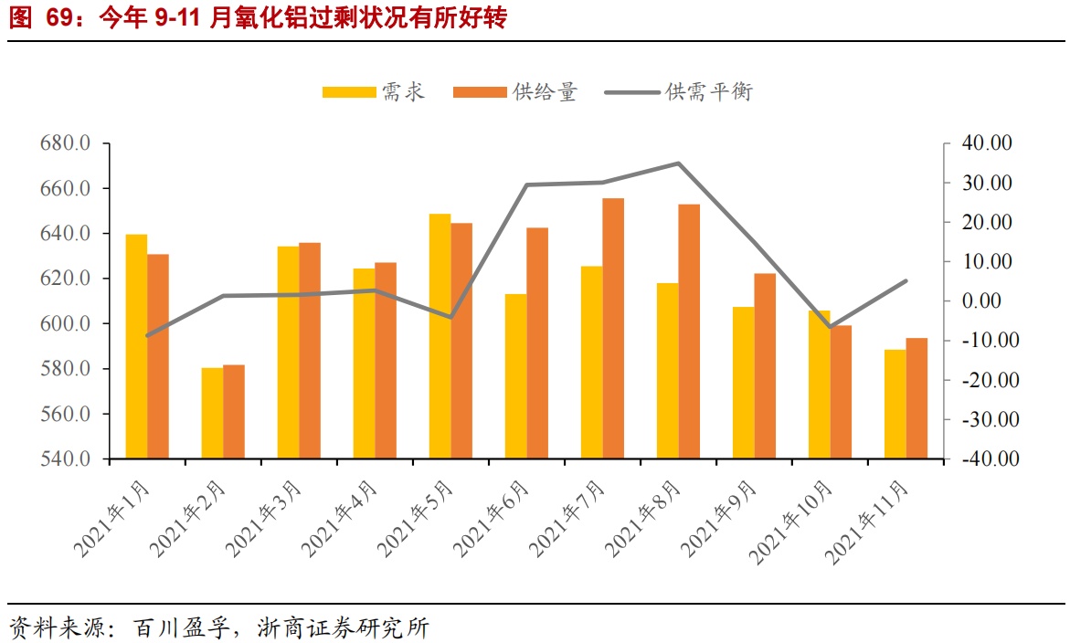 受益于海外电解铝增量以及国内外氧化铝供应干扰,今年9-11月氧化铝过剩状况有所好转。根据百川盈孚数据,在5-8月,国内氧化铝供给量超过需求量29万吨、30万吨、35万吨;但9月和10月降为15万吨、-7万吨,氧化铝供过于求的局面短期有所改善。但由于氧化铝供应端干扰恢复以及上游大宗原材料价格回落,氧化铝从11月开始重新回到供过于求的局面。