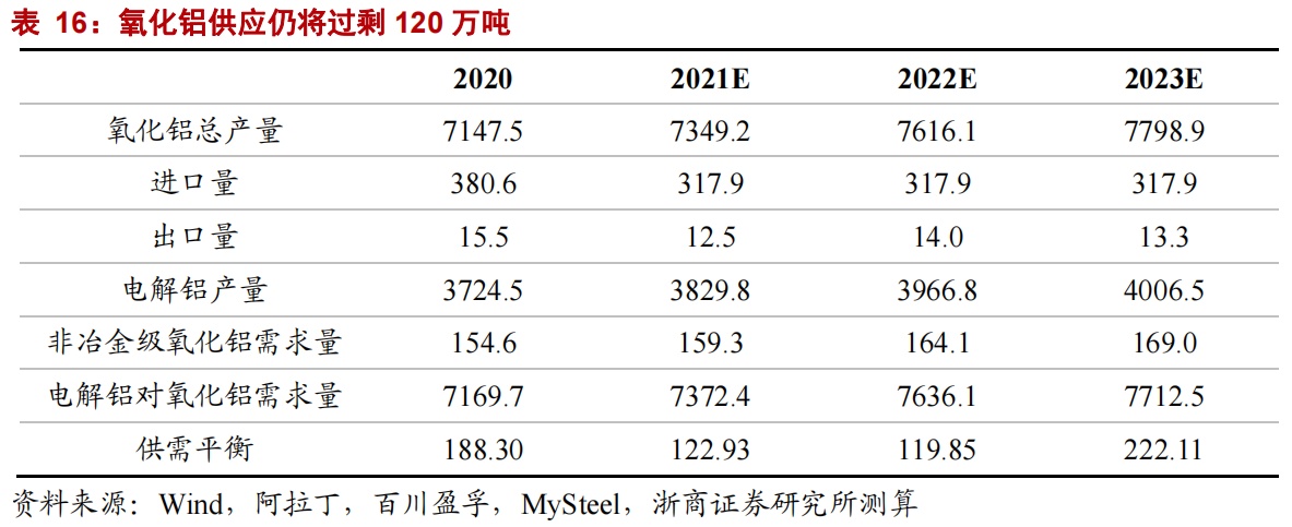 氧化铝需求端,受高铝价刺激,海外电解铝生产积极。除中国以外的地区,近年来电解铝产量同比增速都在1%以内,且逐年走低,2020年海外电解铝产量同比增长仅为0.5%。今年受到高铝价刺激,海外电解铝企业生产积极,2021年海外电解铝企业的产量为2339万吨,同比增长39.9万吨,同比增长1.4%,按照1:1.93换算,对氧化铝需求量增长77.05万吨。