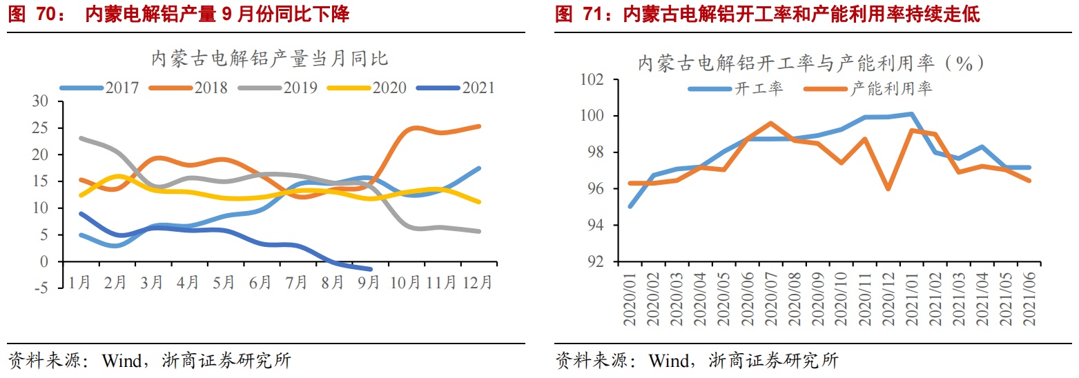 能耗双控直接影响电解铝企业生产。2021年年初,由于内蒙古在2019年的能耗双控考核中未完成任务,内蒙采取多项措施严控能耗。包括未通过审批但已投产项目全部停产;部分在产企业通过降低电流强度和停槽方式减产;新增电解铝产能全部延期;2021年起不再审批电解铝项目等。2021年上半年,内蒙电解铝产量同比增长仅为5.9%,是近年来最低增速。产能利用率从一月份的99.2%降为96.4%。