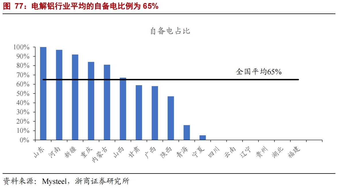 电解铝是典型的高耗能行业,电力成本占比超过1/3。平均来说,每生产一吨电解铝需要13500kWh电力。电力来源一般为自备电站发电和电网供电,电解铝企业普遍将煤电和电解铝配套建设布局,以降低成本,目前电解铝产能中约65%为自备电。