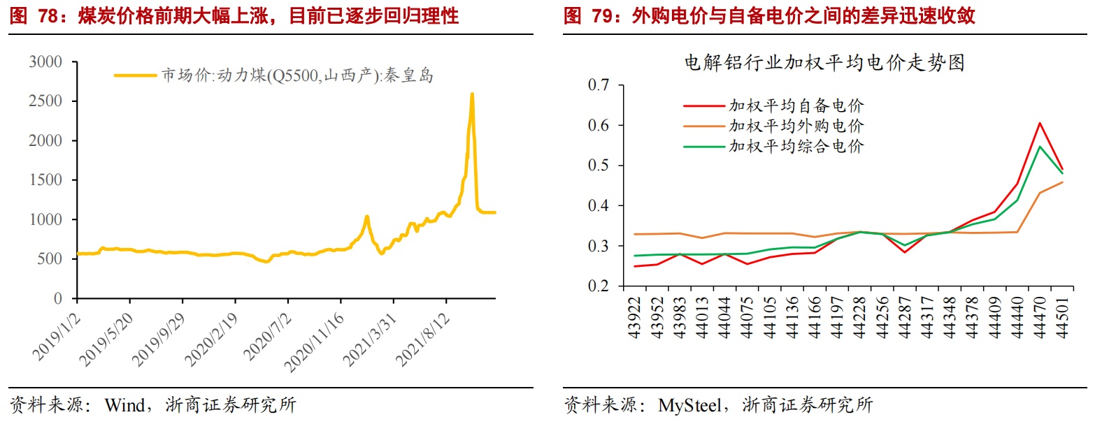2022年煤炭价格与氧化铝价格有望继续下行,成本端压力峰值已经过去。如前所分析,氧化铝过剩格局没有根本性改变,短期影响因素消除之后,氧化铝价格有望继续下行;煤炭是关系到中国国计民生的大宗商品,中央保供稳价的态度明确,预计煤价再难重回巅峰,因此电价端也有望受益。预计2022年成本端下行将增厚电解铝环节盈利,电解铝行业盈利状况筑底。