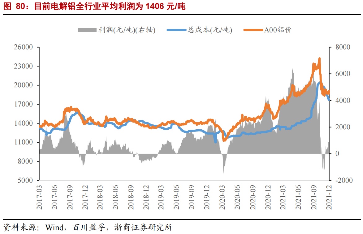 由于成本端煤炭、电力、氧化铝等成本大幅上涨,电解铝盈利状况迅速恶化,11月电解铝全行业平均利润为-313元/吨,行业内多数企业出现即期亏损,此时距离行业盈利高点6500元仅仅时隔2个月。近期由于电解铝价格维稳,煤炭、氧化铝、预焙阳极高位回调,电解铝全行业平均利润为1406元/吨,电解铝行业筑底向好。