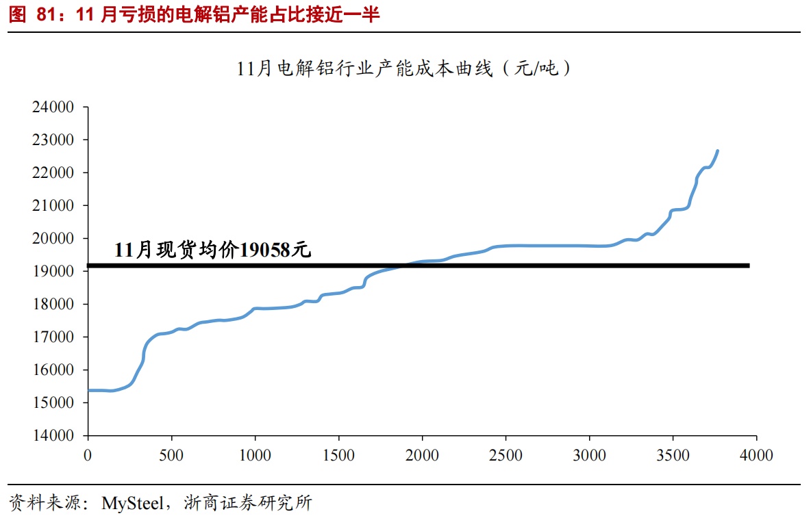11月亏损的电解铝产能占比接近一半。根据Mysteel调研统计,11月电解铝行业成本曲线明显陡峭化,行业内最高成本和最低成本差值高达7398元/吨,具有能源优势的新疆、内蒙、云南等地成本较低,而全部依赖燃煤网电的宁夏、甘肃以及全部依赖外购煤炭自发电的山东、河南成本明显更高。