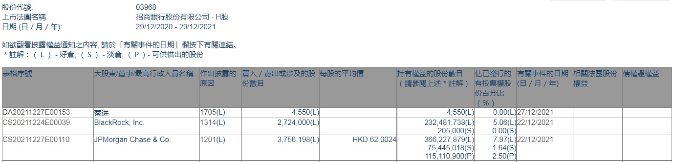 智通财经APP获悉,香港联交所最新资料显示,12月22日,小摩减持招商银行(03968)约375.62万股,每股作价62.0024港元,总金额约为2.33亿港元。减持后最新持股数目约为3.66亿股,最新持股比例为7.97%。