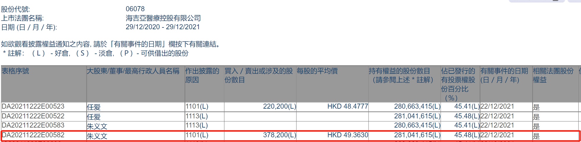 智通财经APP获悉,香港联交所最新资料显示,12月22日,公司主席朱义文增持海吉亚医疗(06078)37.82万股,每股作价49.363港元,总金额约为1866.91万港元。增持后最新持股数目约为2.81亿股,最新持股比例为45.48%。