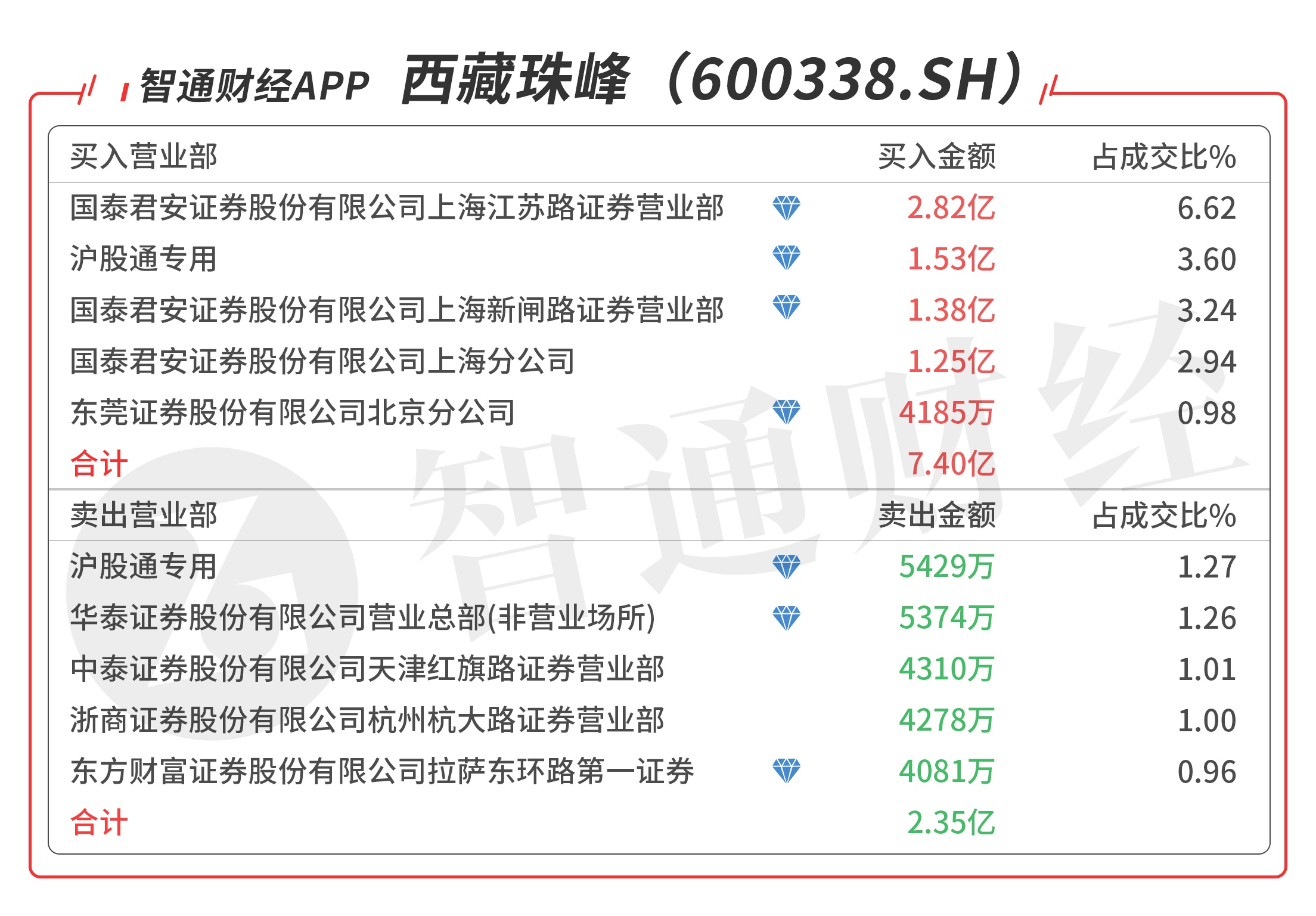 西藏珠峰(600338.SH):龙虎榜阵容豪华,沪股通对倒净买入9872万元,买一是知名游资章盟主的席位买入2.82亿元,买三是知名游资上海超短的席位买入1.38亿元,买四是知名游资的席位买入4185万元,当日净买入5.06亿元,该股今日连板继续涨停,预计有溢价。