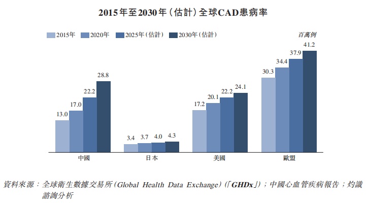 全球视角看,根据2019年全球疾病负担研究,全球冠脉疾病患病率在所有心血管疾病中高居首位,约占所有心血管疾病患病个案的36.4%。截至2020年,全球冠脉疾病患者数目约为2.03亿人,预计于2030年将达到2.65亿人,对应复合增长率为2.7%;而将目光移到中国,至2020年冠脉疾病的患者数量为1700万人,预计于2030年将增加至2880万人,复合年增长率约为5.4%。