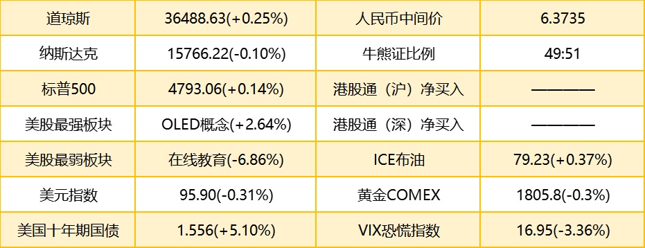 1. 隔夜美股道指涨90.42点,涨幅0.25%,报36488.63点;纳指跌15.51点,跌幅0.10%,报15766.22点;标普500指数涨6.71点,涨幅0.14%,报4793.06点。港股ADR指数下跌,按比例计算,收报23029点,跌57.17点或0.25%。