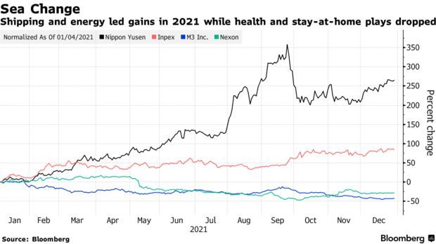 智通财经APP获悉,受益于重新开放的股票在今年领涨日本股市:航运类股在日经225指数中涨幅居前,大宗商品类股在东证指数中表现最佳。与此同时,2020年疫情期间的赢家,如医疗保健类股和居家类股则跌至谷底,视频游戏生产商的股价也大幅下跌,巨头软银集团和迅销的股价也出现了明显下跌。