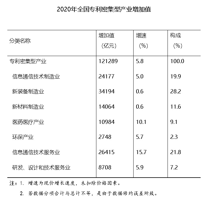 国家知识产权局 国家统计局关于2020年全国专利密集型产业增加值数据公告(第466号)