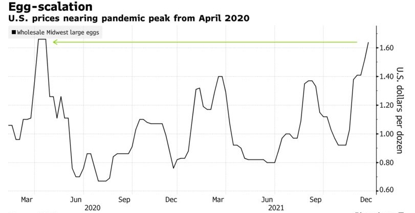 美国农业部数据显示,美国中西部一打大鸡蛋的价格本月稍早触及1.64美元。这是自疫情开始扰乱供应链和推高成本以来的最高水平。近年来,平均价格为近1美元。