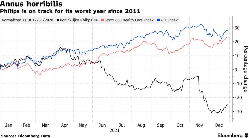 智通财经APP获悉,受产品召回和供应链问题的影响,飞利浦(PHG.US)的股价在2021年暴跌26%,创下10年来最大年度跌幅,同时也是欧洲斯托克600指数中表现最差的医疗保健股之一。 不过,随着召回事件的影响消散,以及对医院手术的需求回升,分析师平均预期该公司股价明年将上涨35%。
