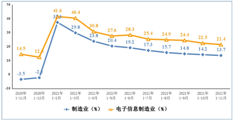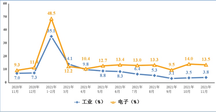 图1 2020年11月份以来电子信息制造业增加值和工业增加值分月增速