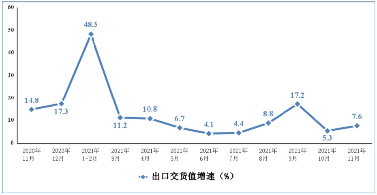 11月份,规模以上电子信息制造业实现出口交货值同比增长7.6%,增速比上月回升2.3个百分点,比同期规模以上工业出口交货值增速低5个百分点。1—11月份,规模以上电子信息制造业累计实现出口交货值同比增长12.6%,增速比上年同期提高7.2个百分点。