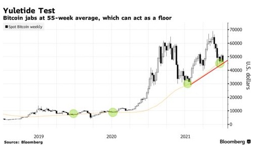 过去两年,比特币一直在55周移动均线这一技术位获得支撑,12月的闪崩以及年中加密货币的暴跌均未能使该加密货币跌破这一位置。然而,技术指标显示,如果未能守住这一关键支撑位,比特币将下探至40000美元。
