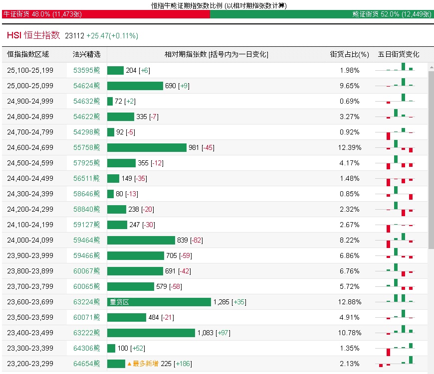 法兴恒指牛熊证街货分布图中的数据显示,熊证街货重货区在23,600-23,699区间,该区间最新熊证数量为1,285张,较上一交易日增加35张;最多新增在23,200-23,299区间,该区间最新熊证数量为225张,较上一交易日增加186张。