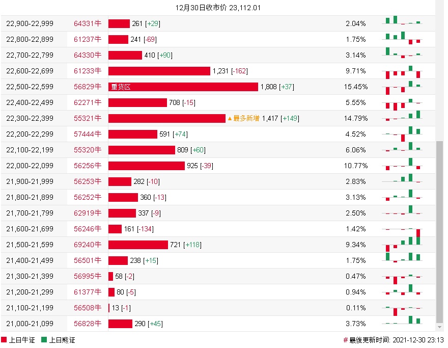 牛证街货重货区在22,500-22,599区间,该区间最新牛证数量为1,808张,较上一交易增加37张;最多新增在22,300-22,399区间,该区间最新牛证数量为1,417张,较上一交易日增加149张。