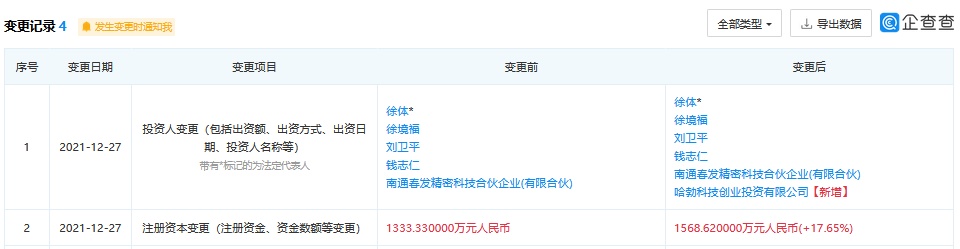 智通财经APP获悉,企查查APP显示,12月27日,南通山口精工机电有限公司发生工商变更,新增华为关联公司哈勃科技创业投资有限公司为股东,同时公司注册资本由1333.33万元人民币增加至1568.62万元人民币,增幅为17.65%。