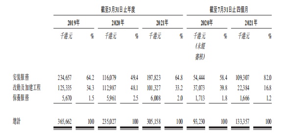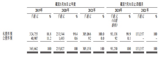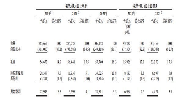 于2019年、2020年、2021年截至3月21日止年度及2020年、2021年截至7月31日止四个月总收益分别约为3.66亿港元、2.35亿港元、3.05亿港元、9323万港元、1.33亿港元;同期,净利润分别为2294.6万港元、959.5万港元、2581.1万港元、698.4万港元、442.1万港元。