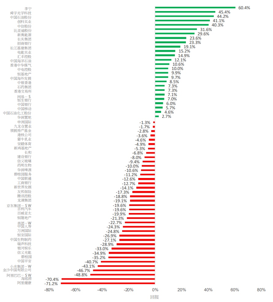 恒生指数成份股:在64只恒生指数成份股当中,26只于2021年上升。李宁(02331),舜宇光学科技(02382),中国石油股份(00857)表现最好,今年分别上涨60.4%、45.4%和44.2%。