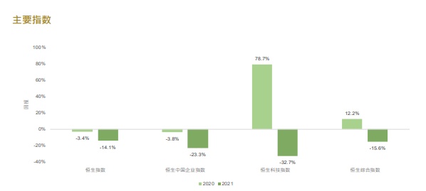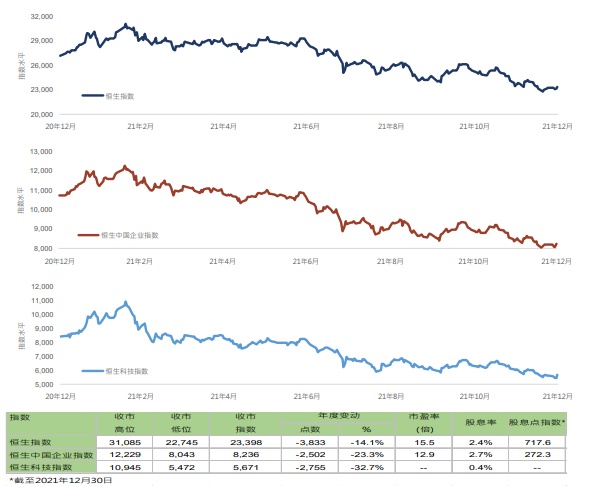 恒生指数、恒生中国企业指数及恒生科技指数:恒生指数于2020下滑3.4%后,在2021年下跌14.1%。恒生中国企业指数全年回报为-23.3%,落后恒生指数9.2个百分点。恒生科技指数全年回报为-32.7%,落后恒生指数18.6个百分点。