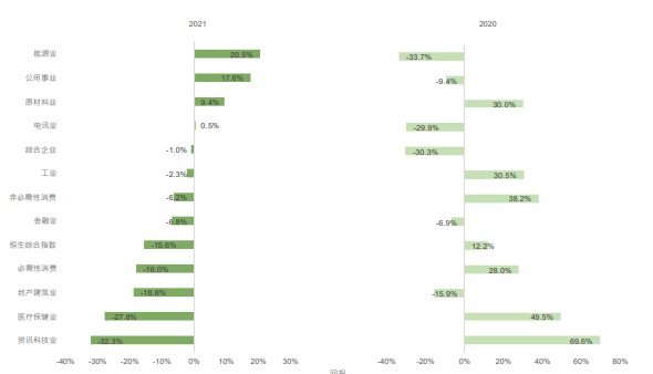 恒生综合指数-行业指数:能源业于2021年表现出众,上升20.5%。资讯科技业和医疗保健业表现较逊色,分别滑落32.3%和27.8%。