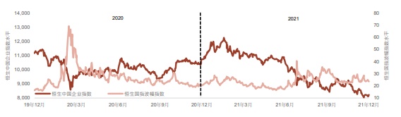 波幅指数:尽管2021年恒指顶点及谷底之间的波幅(8,340点)及国指顶点及谷底之间的波幅(4,186点)均高于2020年的波幅(恒指为7,360点,国指为2,860点),量度恒指和国指30个历日预期波幅的恒指波幅指数和恒生国指波幅指数显示出2021年市场认为风险减低(恒指波幅指数顶点为33.7,恒生国指波幅指数顶点为40.6,相比2020年分别为64.8及69.0)。