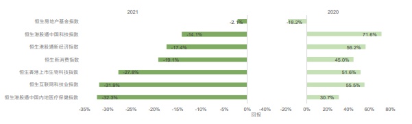 主题指数-香港上市:恒生房地产基金指数于2021年下滑2.1%。