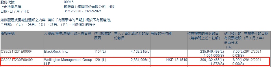 LLP减持龙源电力(00916)288.1996万股,每股作价18.151港元,总金额为5231.11万港元。减持后最新持股数目约为3亿股,最新持股比例为8.99%。