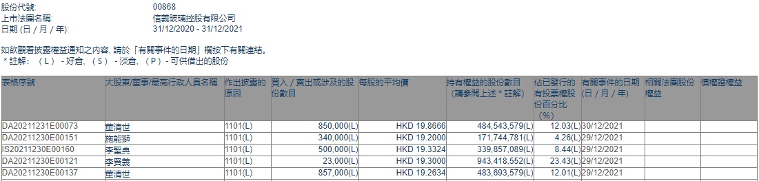 智通财经APP获悉,香港联交所最新资料显示,12月29日,执行董事董清世、执行董事李贤义、李圣典、非执行董事施能狮分别增持信义玻璃(00868)85.7万股、2.3万股、50万股、34万股,每股作价分别为19.2634港元、19.3000港元、19.3324港元、19.2000港元;12月30日,董清世增持信义玻璃85万股,每股作价为19.8666港元。两日增持涉及总金额约为5003.34万港元。增持后董清世、李贤义、李圣典、施能狮最新持股数目分别约为4.85亿股、9.43亿股、3.40亿股、1.72亿股,最新持股比例分别为12.03%、23.43%、8.44%、4.26%。