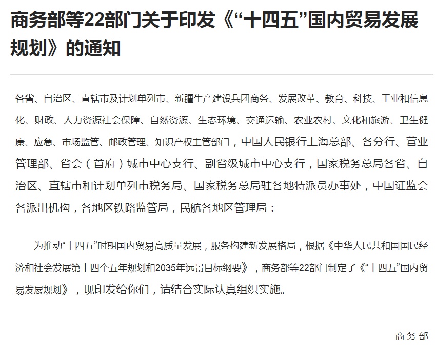 《规划》还提出了对国内贸易发展的主要目标:到2035年,我国消费大国地位进一步稳固,商品和服务消费品质更好满足人民美好生活需要;流通基础设施更加完善,现代化水平显著提升,区域城乡市场协调发展;内外贸一体化融合发展,企业竞争力显著提高,全球资源配置能力显著增强;治理体系基本完善,治理能力显著提升,营商环境更加优化,安全保障能力明显提高,国内贸易对经济社会的综合性效益进一步凸显,为全面建设社会主义现代化国家作出重要贡献。