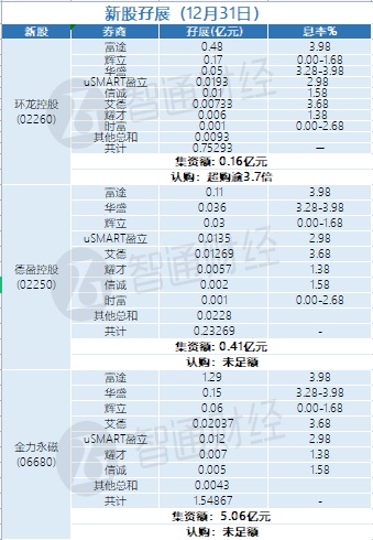 智通财经APP获悉,环龙控股(02260)、德盈控股(02250)、金力永磁(06680)正在招股中。截至12月31日,富途、辉立、华盛等合计为其分别借出孖展0.75293亿港元、0.23269亿港元、1.54867亿港元,环龙控股超购逾3.7倍,德盈控股、金力永磁认购未足额。