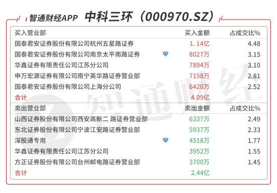 中科三环(000970.SZ):龙虎榜阵容豪华,深股通对倒净买入582万元,买二是知名游资作手新一的席位买入8027万元,买五是知名游资的席位买入6420万元,当日净买入2.07亿元,该股今日连板继续涨停,预计有溢价。