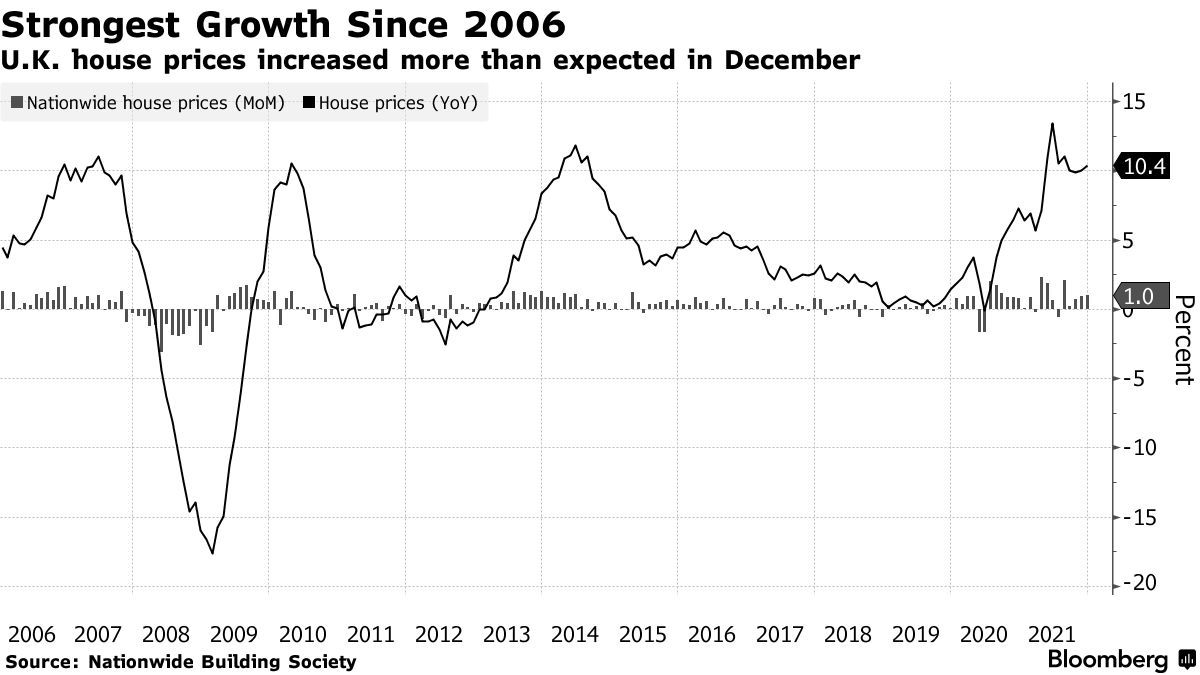 英国房价2021年同比涨幅(12月为基准)则攀升至10.4%,经济学家此前预期为9.4%,同时也是15年来最快增幅(统计范围以上年12月为起点)。