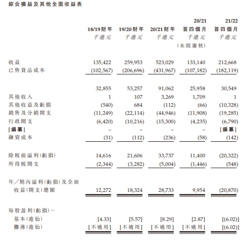 于18/19财年、19/20财年、20/21财年,友和集团收入分别达到1.35亿元(单位:港元,下同)、2.59亿元、5.23亿元。年内溢利分别达到1227.2万元、1832.4万元、2873.3万元。
