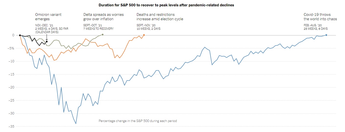 分析:从标普500数据看,自2020年2月新冠疫情爆发以来,美股股市因疫情而引发的每一轮波动都比上一次更短,这意味着投资者在面对疫情时的心态也越来越稳健。如图所示,市场反应时间已从最初的26周缩短到了Omicron发生后的3周,这正是因为市场对于疫情带来的不确定性在不断降低导致的。再加上,随着新冠口服药大规模上市以及疫苗接种率的不断提升,2022年美股市场的投资环境将越来越好。