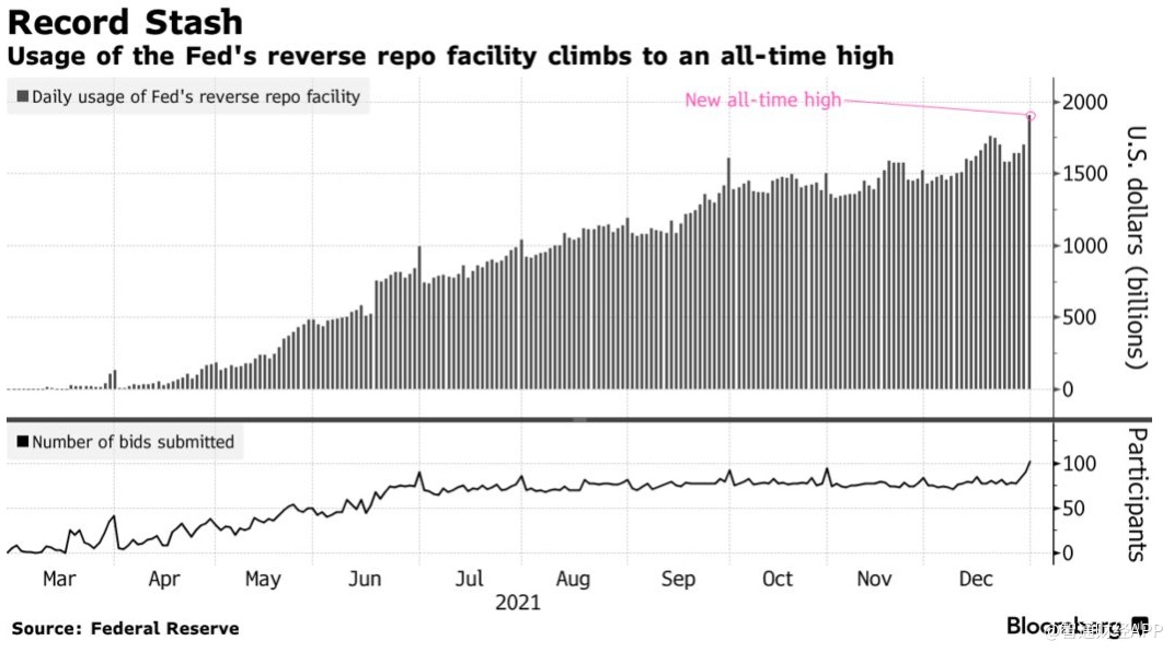 智通财经APP获悉,在2021年的最后一个交易日,投资者存放在美联储隔夜逆回购协议(RRP)机制中的资金数额攀升至历史高点。