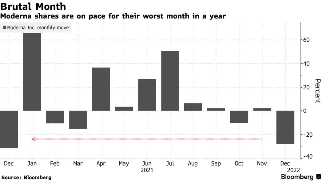 智通财经APP获悉,随着投资者对新冠疫苗制造商的积极情绪减弱,Moderna(MRNA.US)的股价在12月份创下了2021年以内的最大月度跌幅。