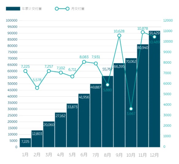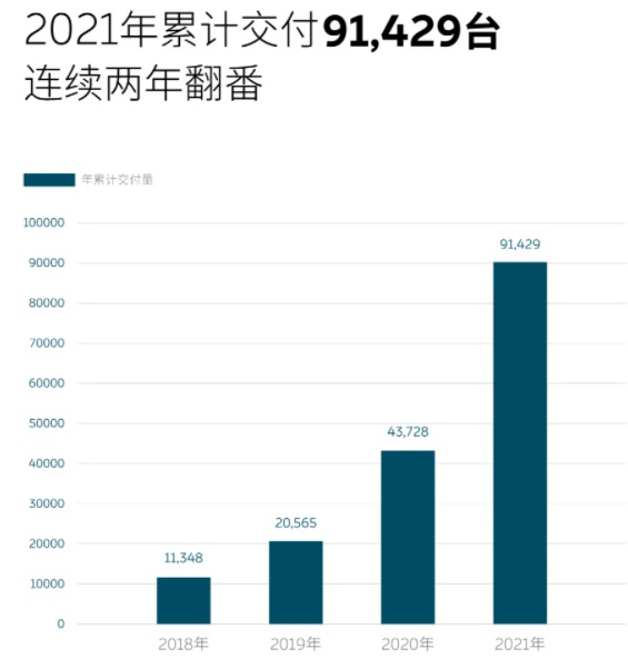 蔚来2021年交付新车91,429台,同比增长109.1%,连续两年翻番。蔚来车辆累计已交付167,070台。