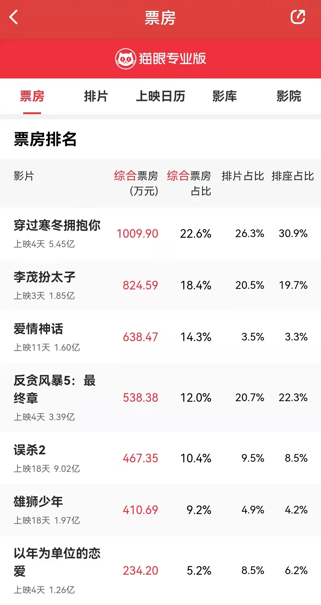 1月3日,《穿越寒冬拥抱你》当日票房仍居首位,共计1009.9万元。《李茂扮太子》、《反贪风暴5:最终章》分别位列第二、第四,当日票房分别为824.59万元、538.38万元。