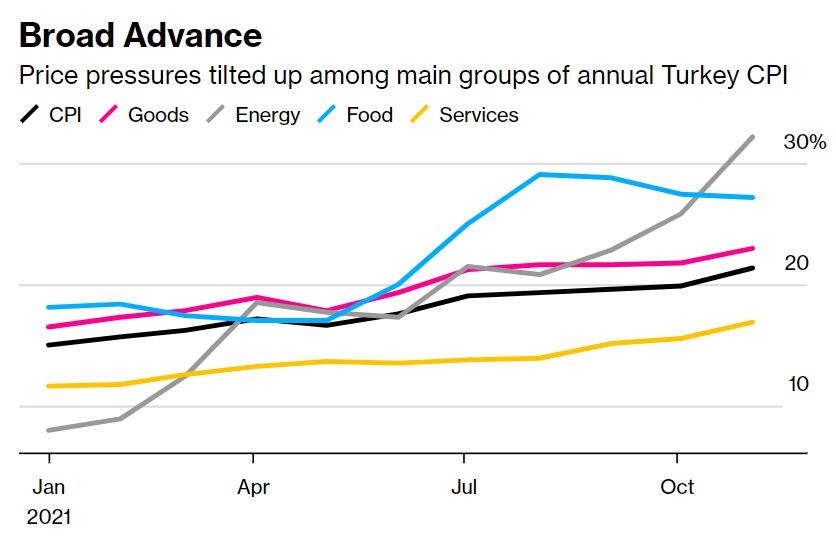 智通财经APP获悉,由于里拉暴跌以及土耳其总统推动降息,土耳其12月的通胀率预将飙升至19年高点。土耳其消费者价格指数(CPI)将连续第七个月同比上涨,2021年12月份CPI预计将同比上升27.36%,而媒体对19位经济学家的调查中值显示,11月份的同比涨幅为21.31%。