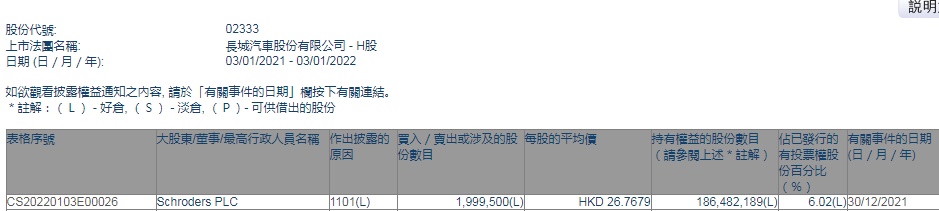 智通财经APP获悉,香港联交所最新资料显示,12月30日,Schroders PLC增持长城汽车(02333)199.95万股,每股作价26.7679港元,总金额约为5352.24万港元。增持后最新持股数目约为1.86亿股,最新持股比例为6.02%。