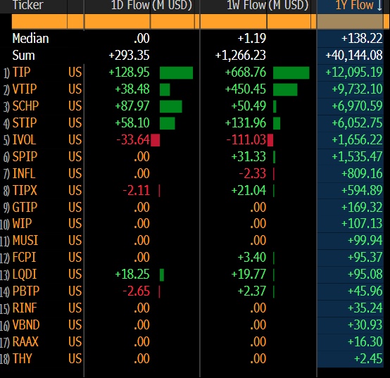 在这一背景之下,与通胀挂钩的二级市场投资需求激增,投资者希望对冲价格上涨的风险。Bloomberg统计的数据显示,所有名称或ETF描述中含有“通胀”一词的ETF,去年都实现了资金流入。